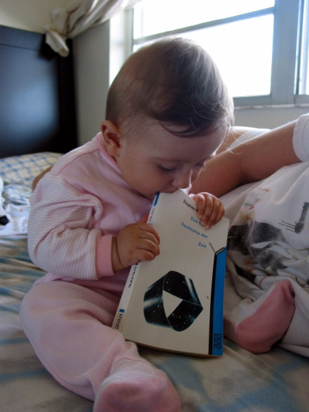 Pearl is reading Stephen Hawkings in German |